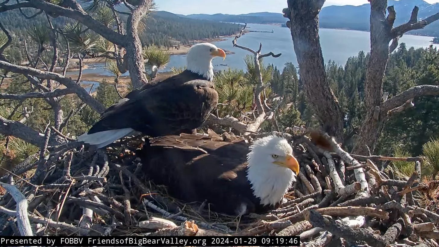 Which leads me to share the last feature of today’s newsletter: the BEST screen time I’ve had all week. For the past year I’ve been keeping an eye on the livestream Big Bear Valley Bald Eagle Nest Cam, and the eagles just laid two beautiful eggs. If successful, they will hatch the first week of March. I’ll be spending the next month watching these birds be birds. Highly recommend.